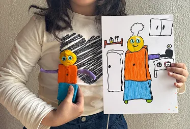 Un taller en el que los niños crean una figura utilizando sólo volúmenes geométricos, y posteriormente dibujan su creación en 2 dimensiones.