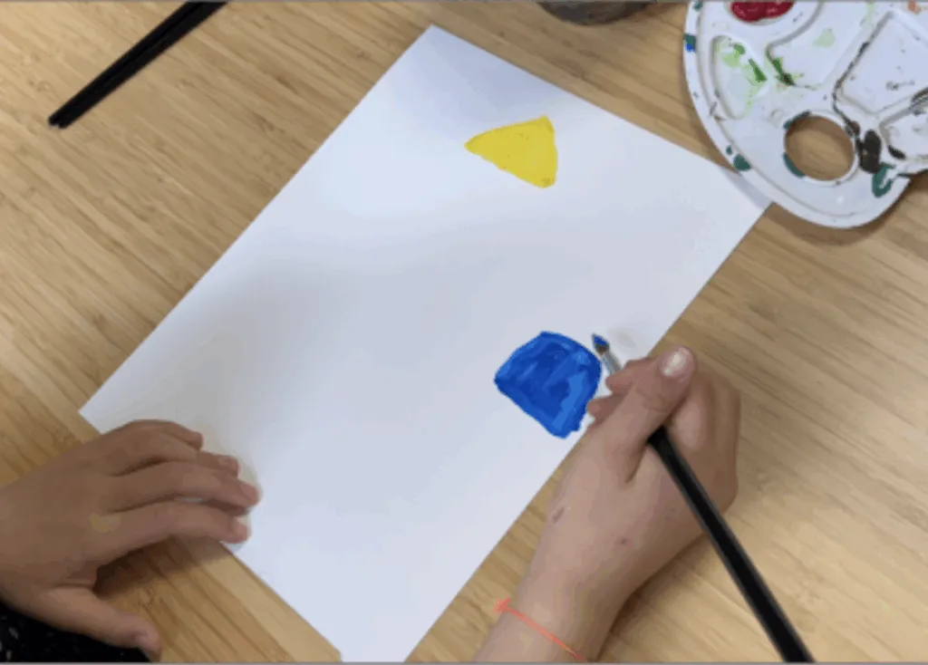 1. Utilizando las témperas, Pinta en un papel 3 formas con los 3 colores primarios: un triángulo amarillo, un cuadrado azul y un círculo magenta. Hazlo formando una circunferencia entre las 3 figuras, dejando hueco entre ellas.