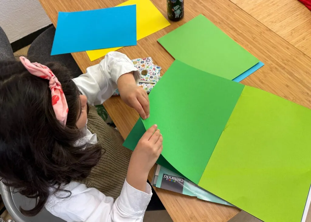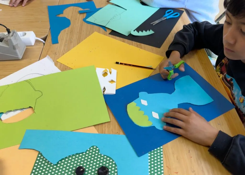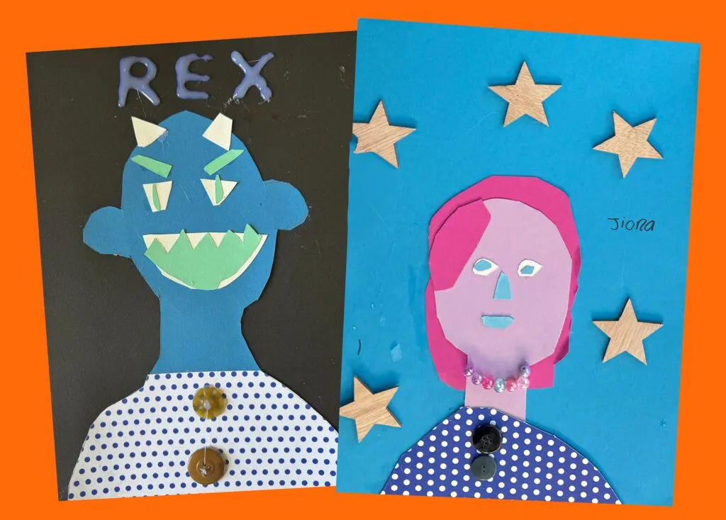 2. Recortamos las formas del personaje: la cara, el pelo, la ropa… y lo pegamos en una cartulina, superponiéndolas una encima de otra para conseguir volumen.